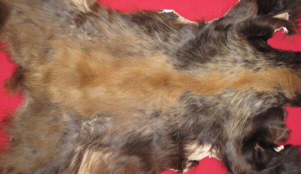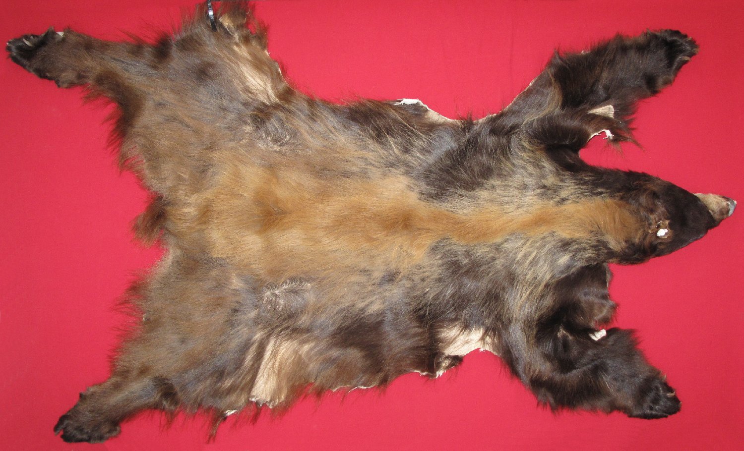 The bear displays a striking “wild ass” coloration, with a distinctive golden-bleached dorsal stripe of fur (up to 4″ in length) along the center of the back. The surrounding early summer coat is sparse, as expected for the season, with darker chocolate-brown fur beginning to regrow along the sides and extremities. This transitional fur stage gives the pelt a unique character that many collectors and taxidermists value for lifelike mounts or artistic presentations.