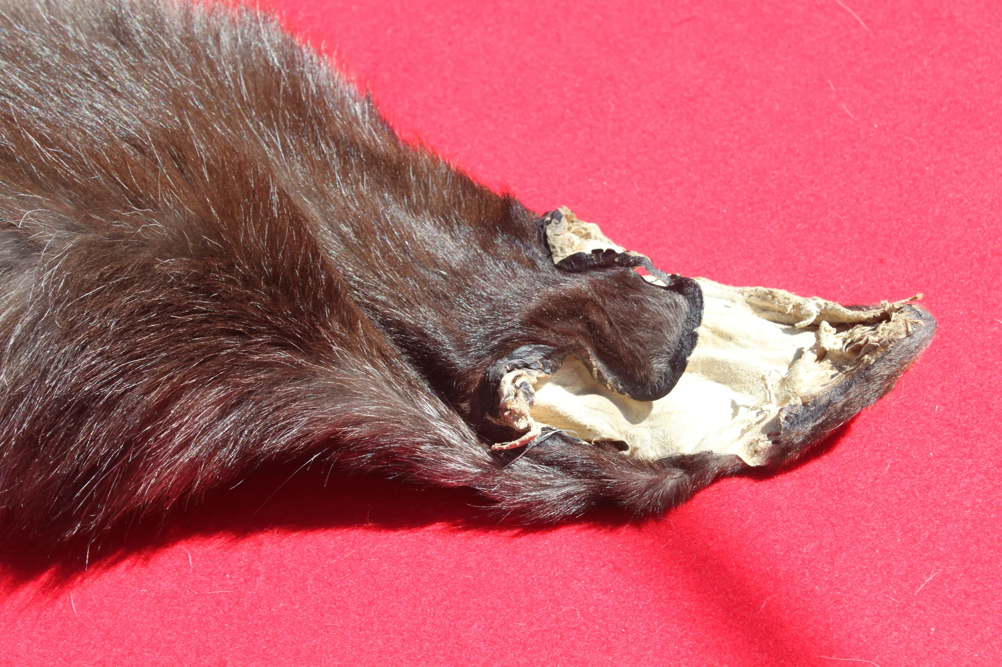 Overall, this hide is in excellent taxidermy condition. The only noted flaw is a small approximately 1-inch section of the upper left lip that has torn away from the fur edge. Importantly, all fur in this area remains intact; only the lip leather piece itself is missing. This is a minor imperfection that can be addressed or concealed during mounting and does not detract from the overall quality or usability of the hide.