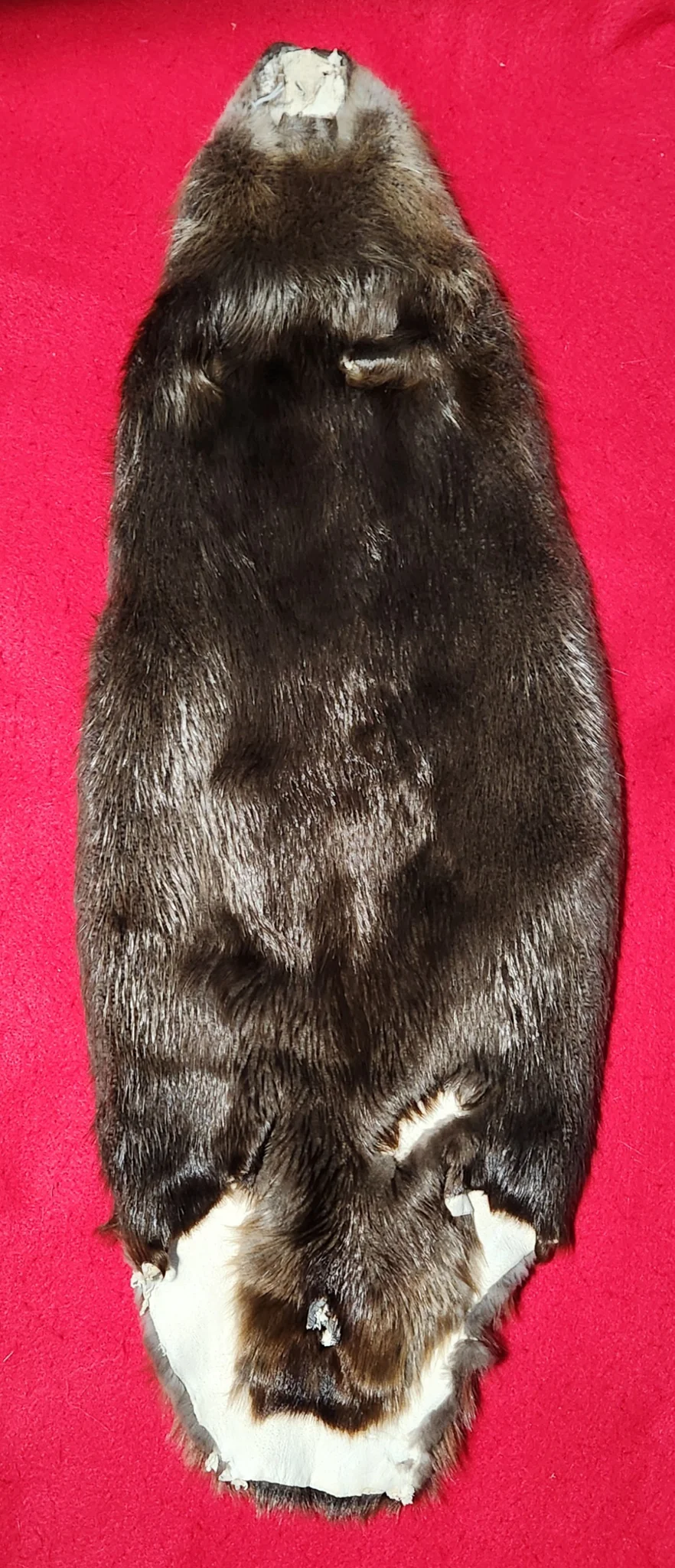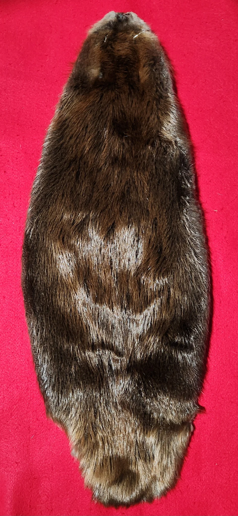 The pelt measures approximately 36 inches in total length and 13 inches in width, representing an exceptionally large beaver. Overall condition is good; however, there is an approximate 3″ x 1″ hole located just ahead of the vent at the base of the belly, which should be taken into consideration during mounting or finishing.